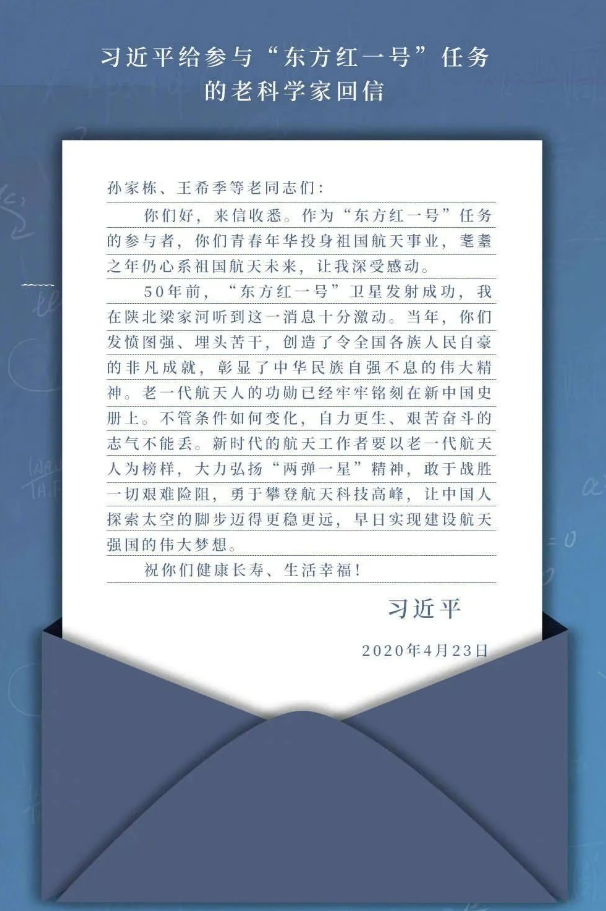 5年前,孫家棟、王希季、戚發(fā)軔、胡世祥、潘厚任、胡其正、彭成榮、張福田、陳壽椿、韓厚健、方心虎等11位參與“東方紅一號”任務的老科學家給習近平總書記寫信,回顧了中國航天事業(yè)發(fā)展的輝煌歷程,表達了對實現(xiàn)中國夢、航天夢的堅定信心。