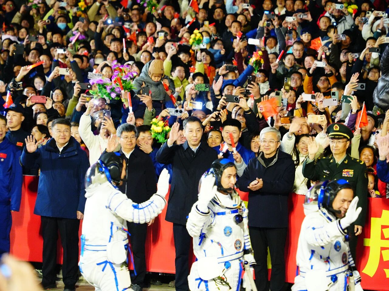 空間站應(yīng)用與發(fā)展階段飛行任務(wù)總指揮部有關(guān)成員以及航天科技人員、各族群眾代表在現(xiàn)場為航天員乘組壯行。